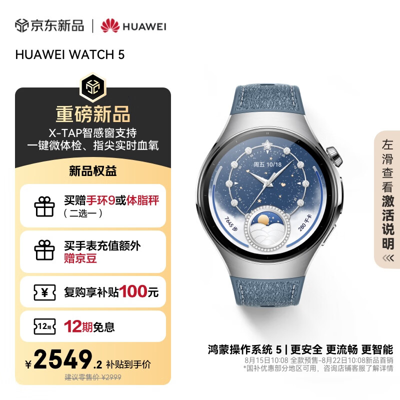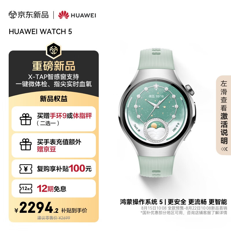 华为WATCH 5星河蓝/极光绿新色上市:鸿蒙5系统加持,券后2599元起