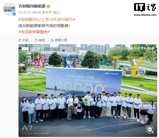8 月 22 日消息,吉利今日宣布银河 A7 混动家轿上市 14 天交付破万,限时指导价 8.18 万元起。该车于 8 月 8 日正式上市,新车是首款基于 GEA 架构打造的插混轿车,搭载雷神 AI 电混 2.0 系统及 Flyme Auto 智能座舱。