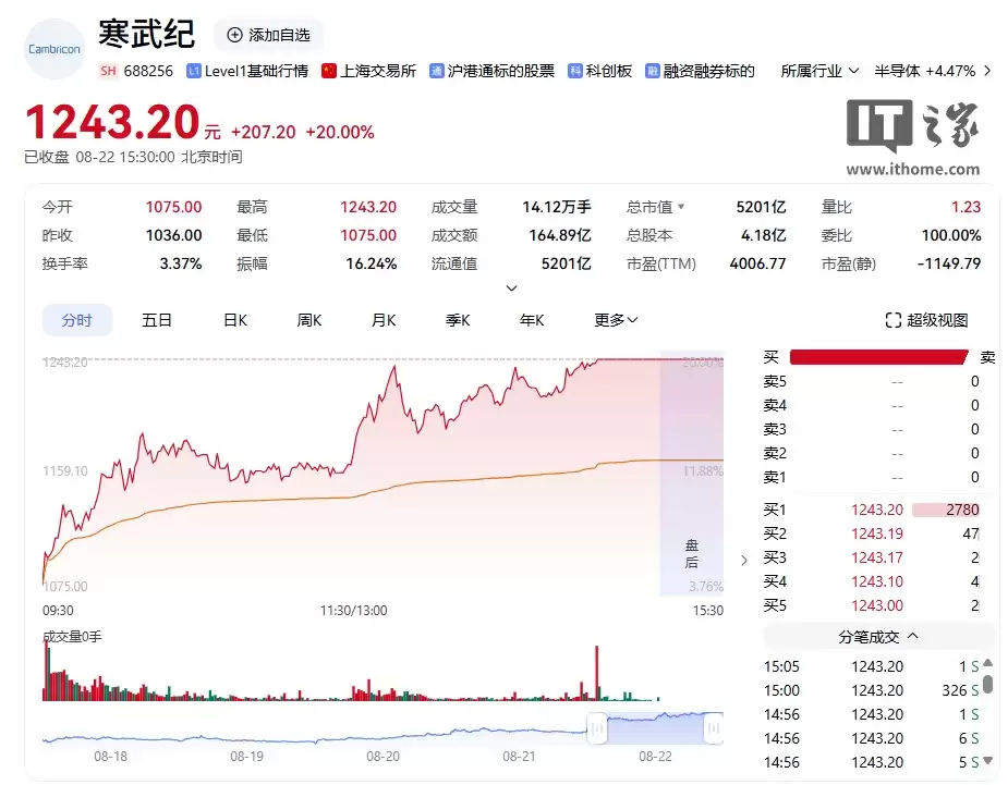 8月22日最新消息显示,寒武纪今日股价延续强劲涨势,盘中涨幅一度达到20%触发涨停线。截至发稿时,该股报价已攀升至1243.2元,公司总市值突破5200亿元大关,股价与市值双双刷新历史纪录。