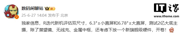 该博主曾在今年 6 月爆料了类似信息,表示该机评估双尺寸,6.3 英寸 ± 小直屏和 6.78 英寸 ± 大直屏,测试 2 亿大底主摄,除了潜望镜、无线充、金属中框,还考虑下放一个新旗舰级硬件。