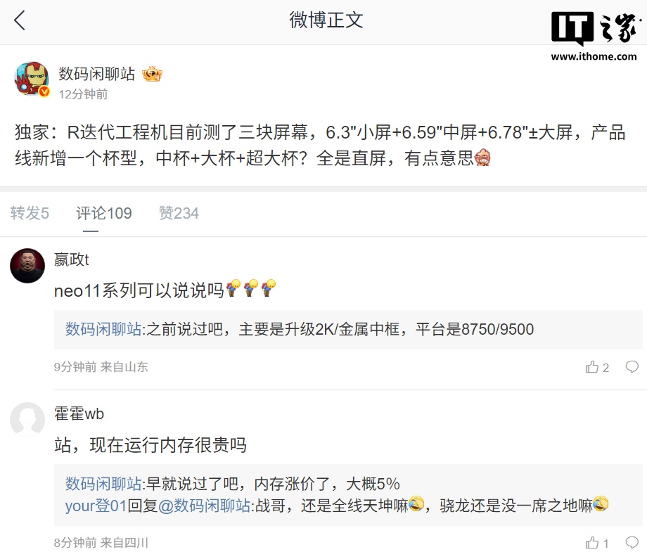 该博主还称,iQOO Neo 11 系列主要是升级 2K / 金属中框,平台是 8750/9500。