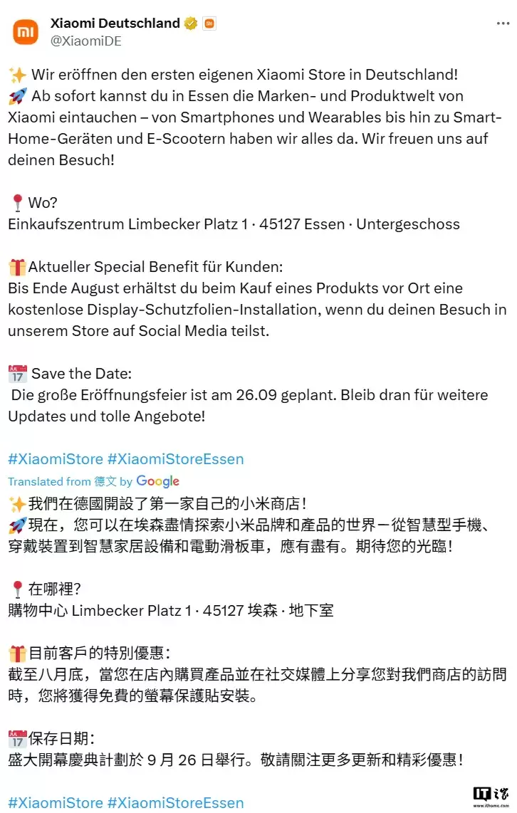 8 月 22 日消息,小米德国本周(8 月 19 日)在 X 平台宣布,其位于北莱茵-威斯特法伦州埃森市的第一家官方直营店已开启试营业,将在 9 月 26 日举行开业典礼。