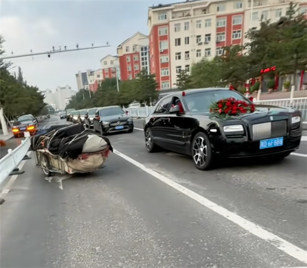 当车队行驶至赤峰市红山区钢铁街等红灯时,一位大爷骑着三轮车不慎与劳斯莱斯发生碰撞。