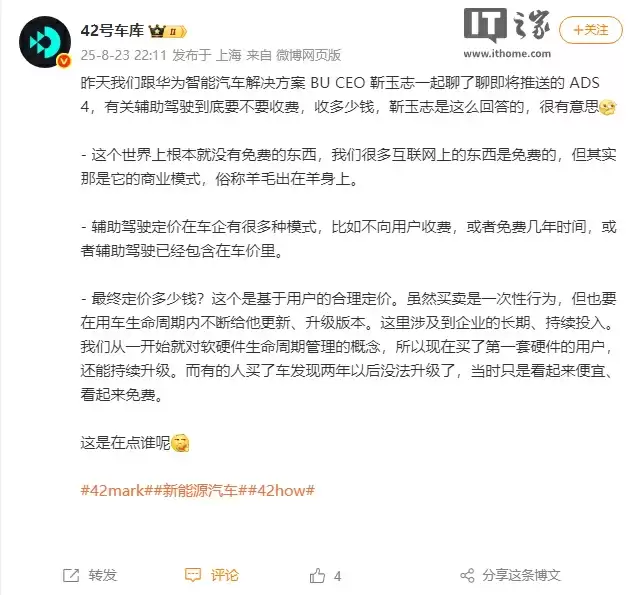 @42号车库 表示,靳玉志昨天在接受采访时谈到了即将推送的 ADS 4,有关辅助驾驶到底要不要收费、收多少钱,靳玉志是这么回答的: