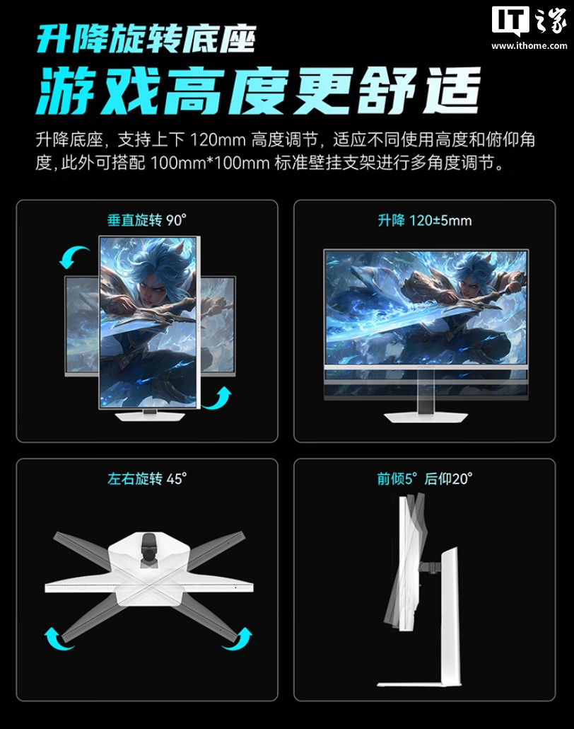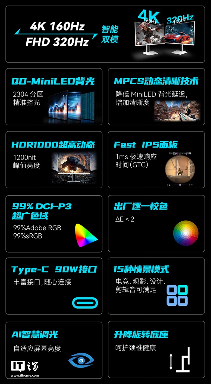 该机配备的 Mini LED 背光技术(2304 分区) Fast IPS 面板支持以 3840x2160@160Hz 或 1920x1080@320Hz 显示,显示器峰值亮度 1200 尼特,静态对比度 1000:1,响应速度 1ms,覆盖 99% DCI-P3 色域和 99% sRGB 色域。