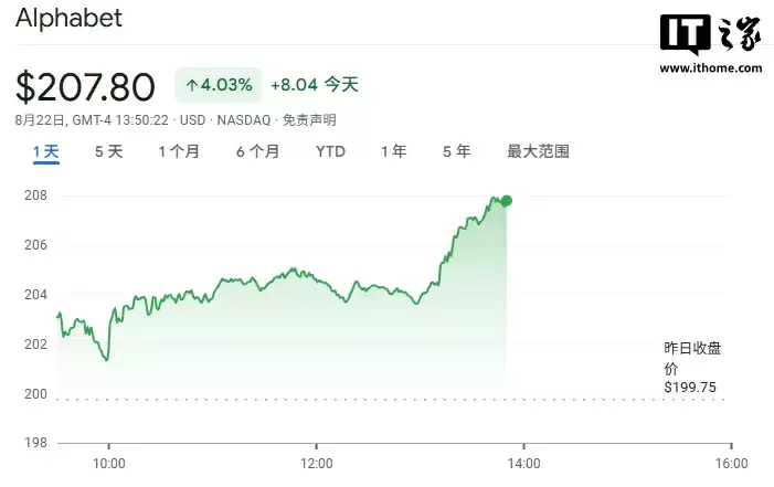 受此消息影响,谷歌与苹果股价在周五交易时段持续攀升,多次刷新当日高点。截至发稿,谷歌股价上涨4%至207.80美元,苹果涨幅达1.4%至227.95美元。