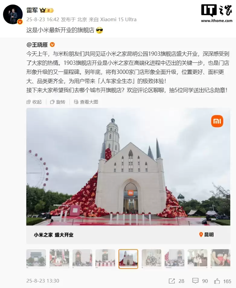 8 月 23 日消息,小米集团高级副总裁、中国区总裁王晓雁今日发文称:今天上午,与米粉朋友们共同见证小米之家昆明公园 1903 旗舰店盛大开业,深深感受到了大家的热情。