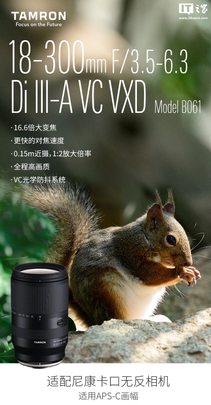 据腾龙介绍,这款镜头相比已上市的索尼 E 卡口 / 富士 XF 卡口版本参数没有变化,适用于 APS-C 画幅的相机,拥有 16.6 倍变焦比,焦段覆盖 18-300mm,无需费时更换镜头即可体验从超长焦直至广角的摄影乐趣。可用于风景、抓拍、人像、动物和体育等场景的摄影。
