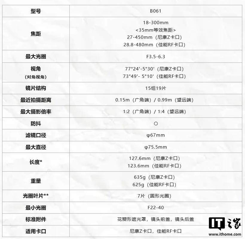 附腾龙 18-300mm F3.5-6.3 镜头佳能 RF / 尼康 Z 卡口版本详细参数如下: