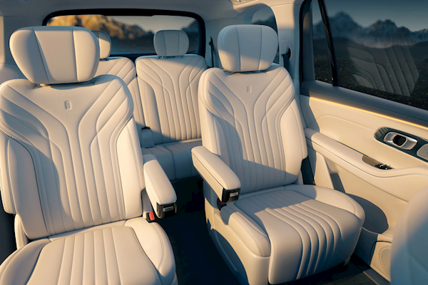 座椅采用打孔真皮材质,中央通道后方设有一个大尺寸的扶手箱,第二排为两个独立航空座椅,过道宽度有180mm,配备无缝腿托、腰托,具备通风、加热、10点按摩。