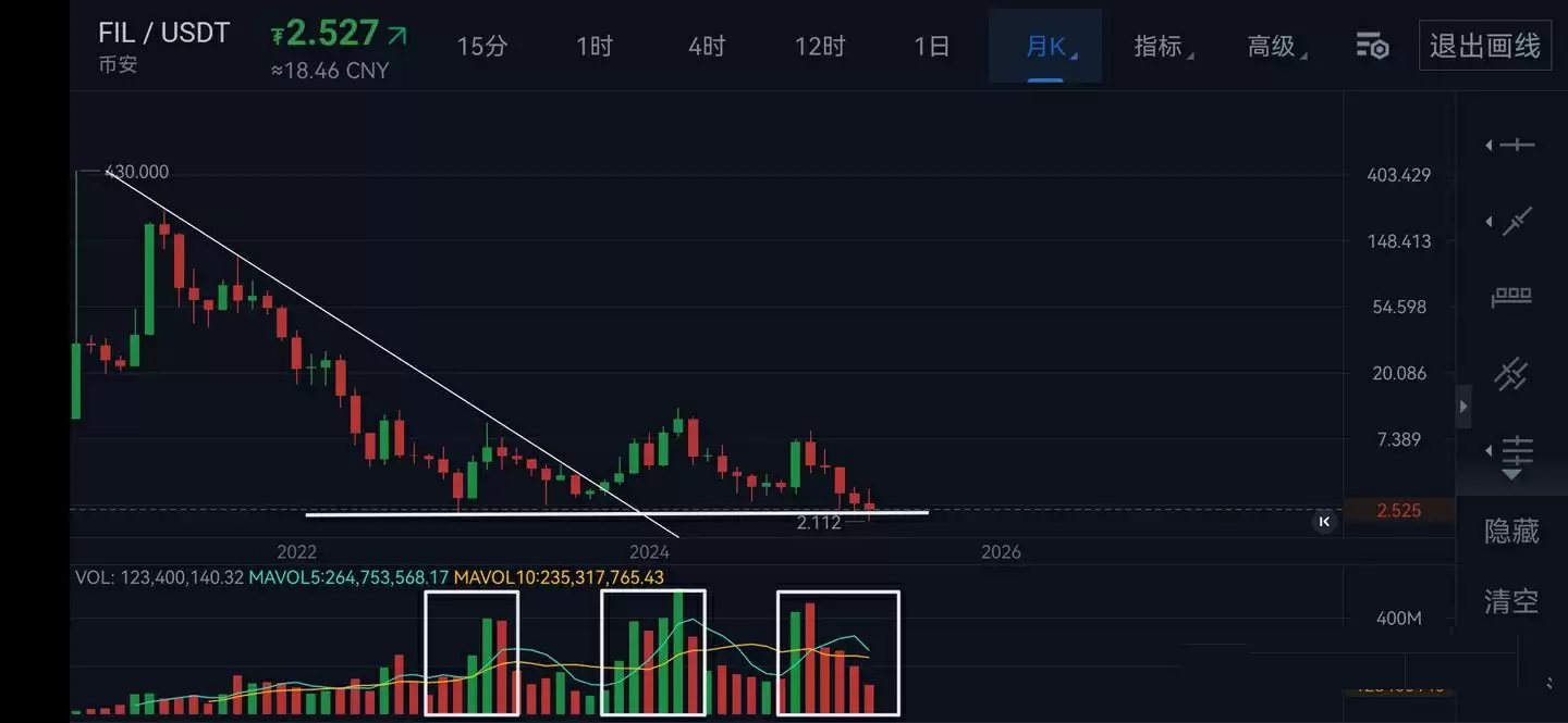 从技术面来看:FIL月线在长期下跌后,于2023年10月突破了下降趋势线,这本身就是趋势转变的重要信号。