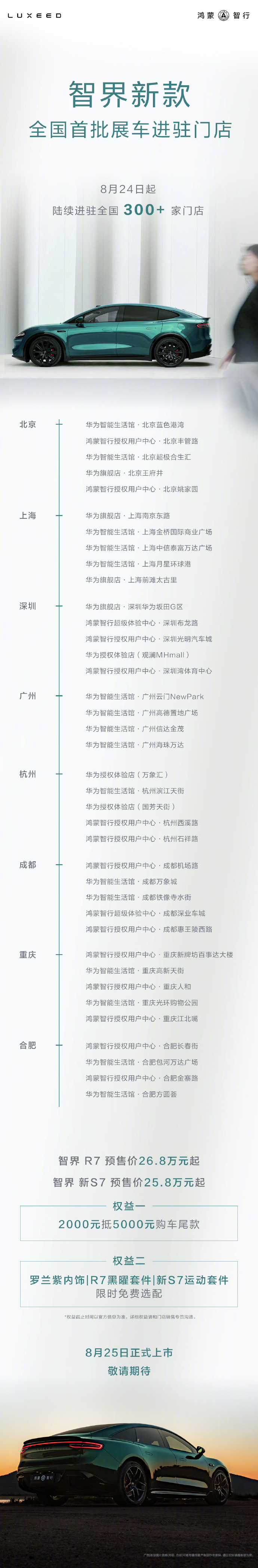 鸿蒙智行新款智界 R7 / S7 陆续进驻全国 300+ 门店:预售 25.8 万起,明日上市