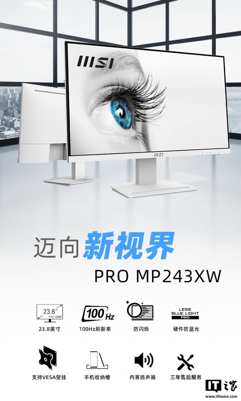 白色外壳 + 内置扬声器,599 元微星推出 23.8 英寸 1080P 100Hz 显示器“PRO MP243XW”