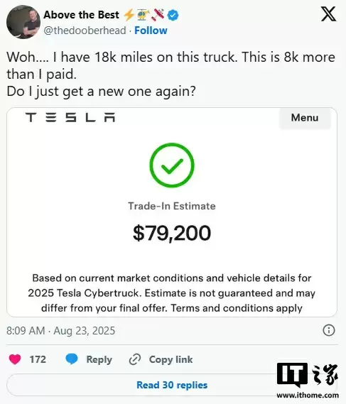 8 月 24 日消息,本周末,特斯拉的二手车置换估值系统出现了故障,导致许多 Cybertruck 以旧换新的估值高于其原始购买价格。