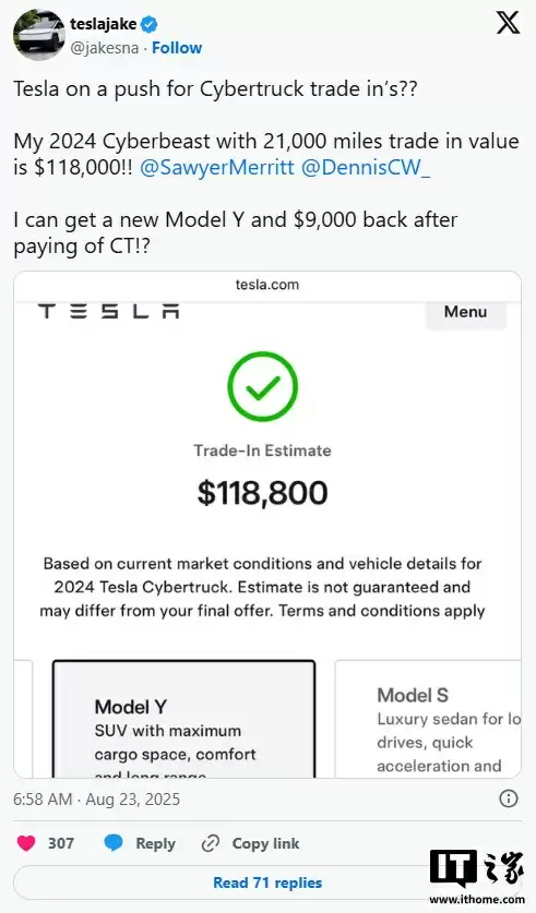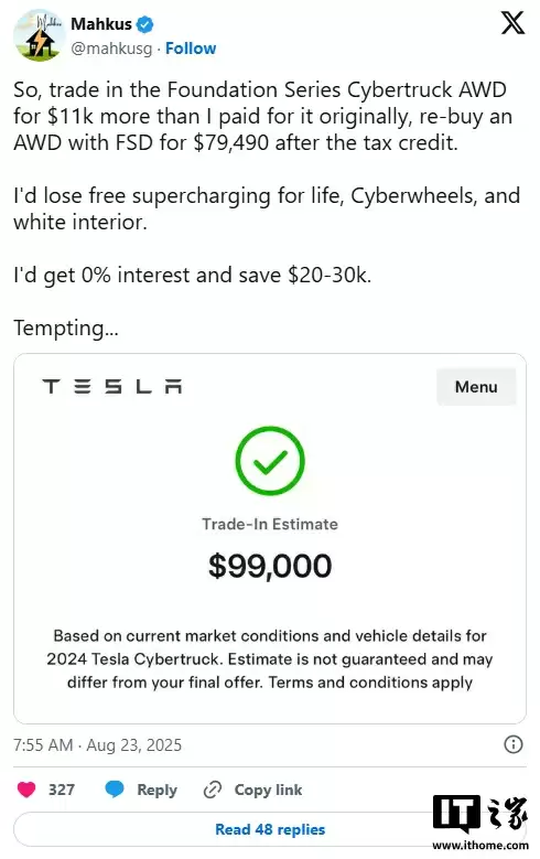 据了解,特斯拉为有意购买其车辆的消费者提供在线二手车置换估值服务。然而在过去几天里,通过该系统提交车辆估值的 Cybertruck 车主们惊讶地发现,特斯拉给出的车辆估值极高,甚至都超过了他们当初购买这辆电动皮卡时的价格。