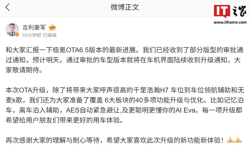 8 月 24 日消息,极氪官方今日发布说明,称接到业务团队的最新信息,部分车型的部分版型已通过 OTA 审批,立即进行 OS 6.5 和 OS 5.5 的推送前序准备工作,将于明天周一陆续开启升级。