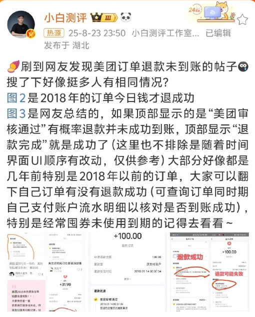 8月24日消息,据媒体报道,近日,多位网友在社交平台表示“美团订单退款未到账”,并晒出相关订单和付款账户流水截图。