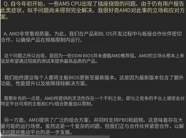 AMD方面表示,烧毁问题的根本原因是某些ODM BIOS不符合AMD的推荐值。AMD进一步澄清称,该问题十分复杂,正在与合作伙伴密切合作解决。AMD还建议用户将主板BIOS更新至最新版本。