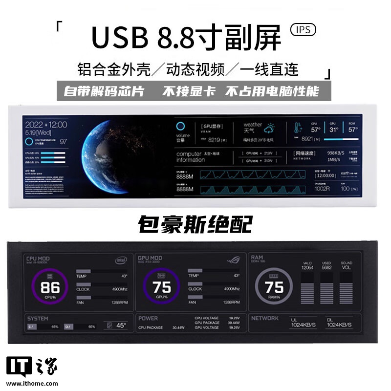 获悉,这款副屏整体尺寸为 237 x 73 x 13 mm,匹配一块 1920x480 分辨率 60Hz 面板,亮度 500 尼特,配备了一个可调节高度与倾斜角度的安装支架,同时也支持使用标准风扇螺丝安装在机箱内外,或直接使用胶水 / 自行安装磁铁将其固定在任何平面上。