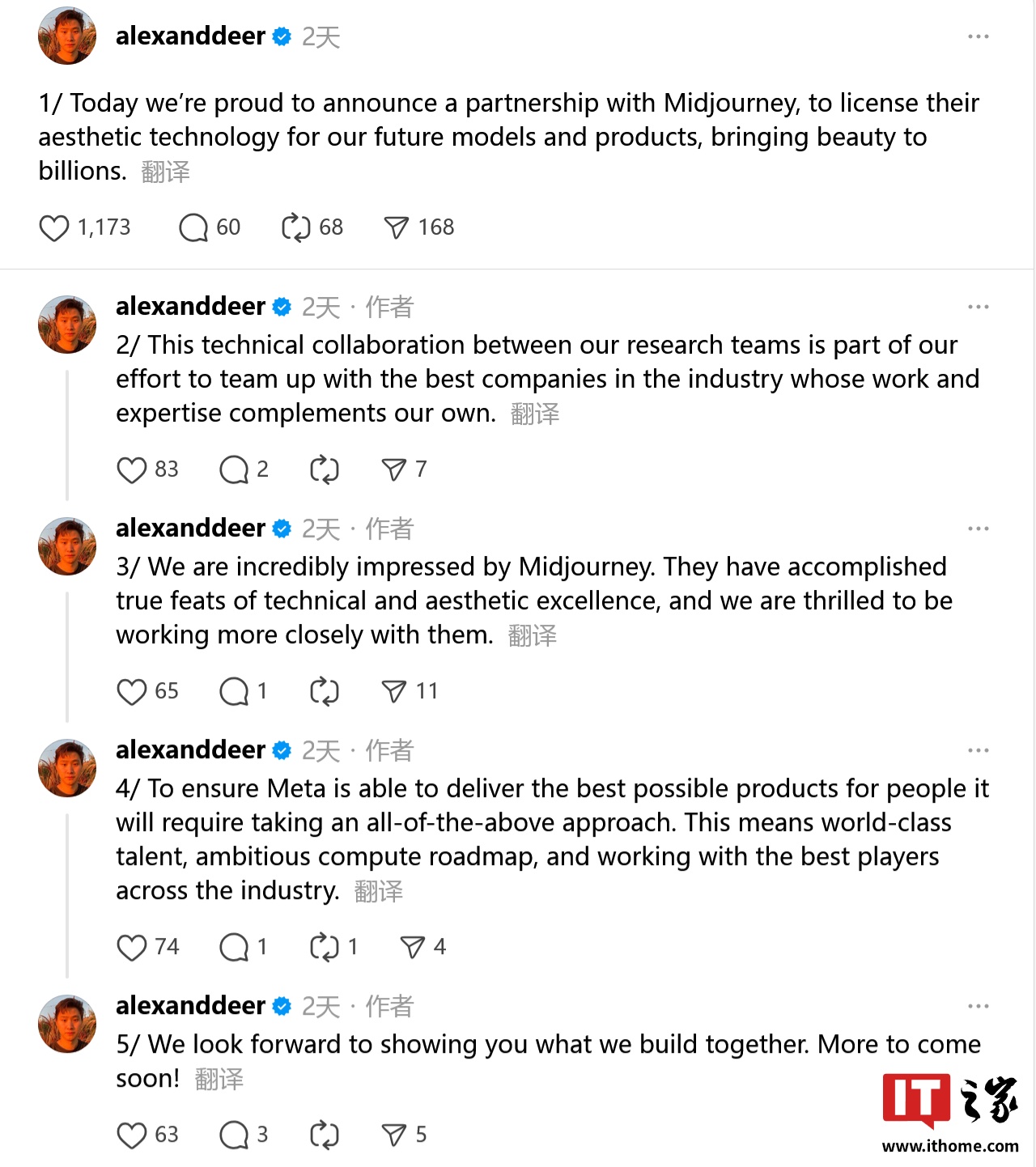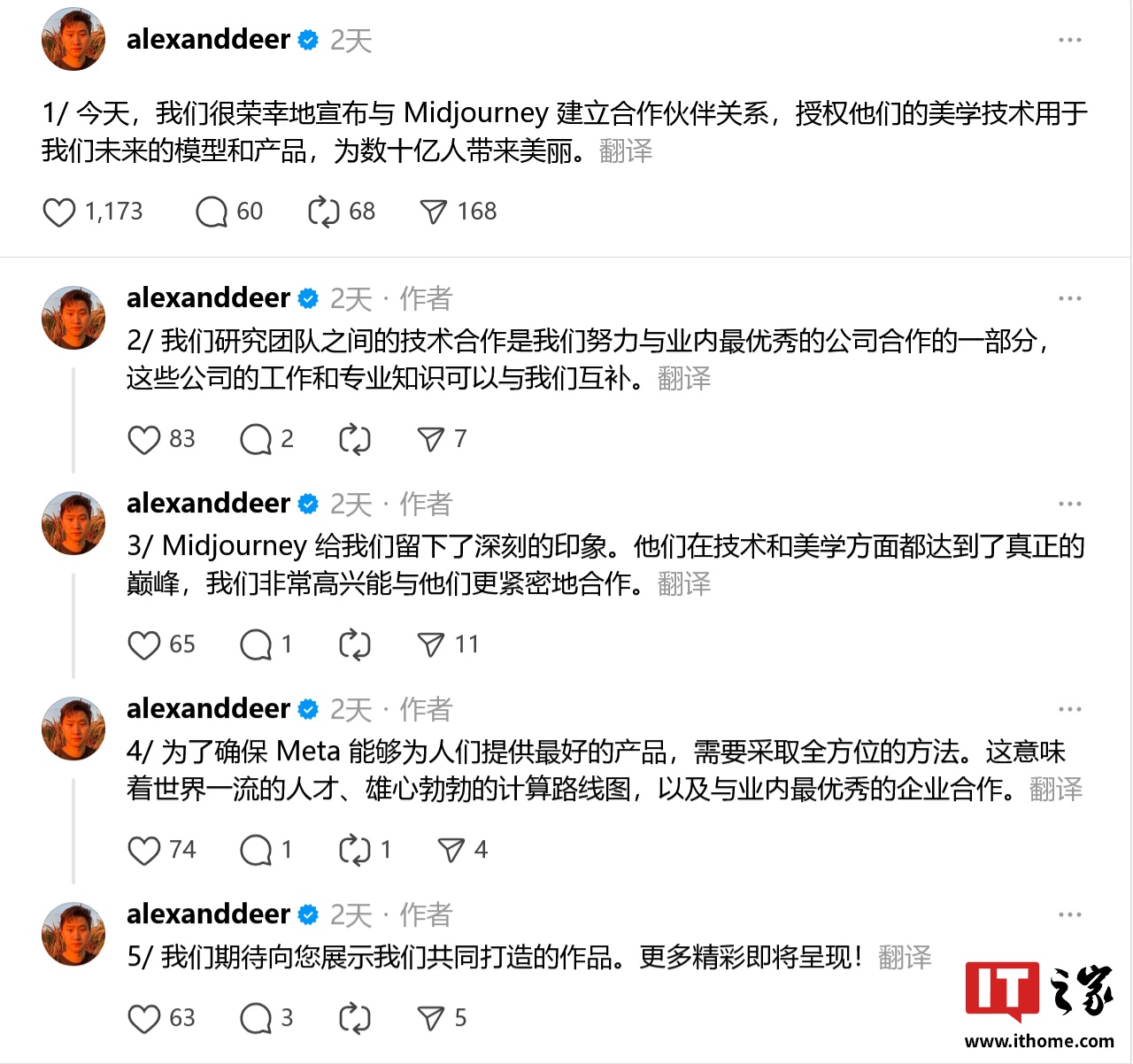 8 月 25 日消息,Meta 首席 AI 官 Alexandr Wang(注:中文名为汪滔)上周六在社交平台 Threads 宣布,Meta 已与 AI 文生图片 / 视频领域研究团队 Midjourney 达成一项授权合作关系:Meta 未来的 AI 模型和产品将可使用 Midjourney 的美学技术。