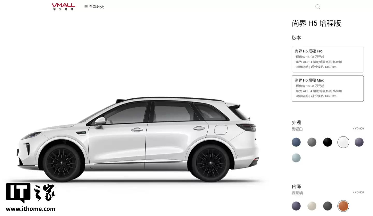 目前,尚界 H5 汽车的选配页面已公开,其中搭载华为 ADS 4 辅助驾驶高阶版的车型最低 18.98 万元起。具体如下: