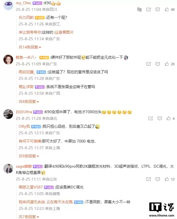 8 月 25 日消息,博主 @数码闲聊站 今日曝光某厂子系迭代新机的部分规格,评论区网友推测为小米 REDMI K90 系列。