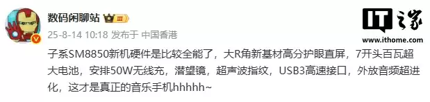 在此之前,该博主曾爆料某厂新机搭载 SM8850 处理器(暂称第二代骁龙 8 至尊版),大 R 角新基材高分护眼直屏,7 开头百瓦超大电池,安排 50W 无线充,潜望镜,超声波指纹,USB3 高速接口,外放音频超进化。结合来看,预计两条爆料均指向 REDMI K90 系列。