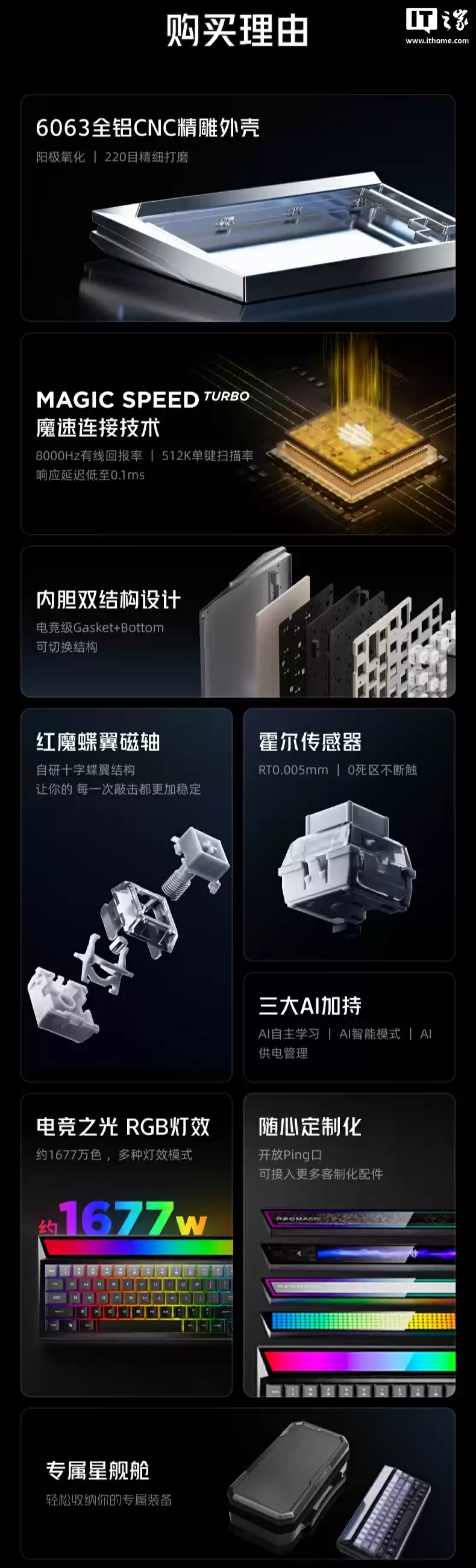 红魔首款全金属外壳磁轴键盘拥有三大 AI 加持,包括 AI 自主学习、AI 智能模式、AI 供电管理,配备 1677 万色 RGB 灯效,支持 MAGIC SPEED TURBO 魔速连接技术,提供红魔蝶翼磁轴(自研十字蝶翼结构)。
