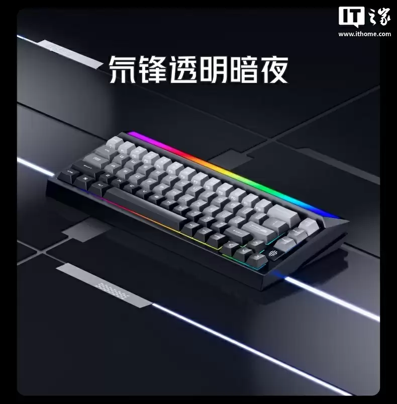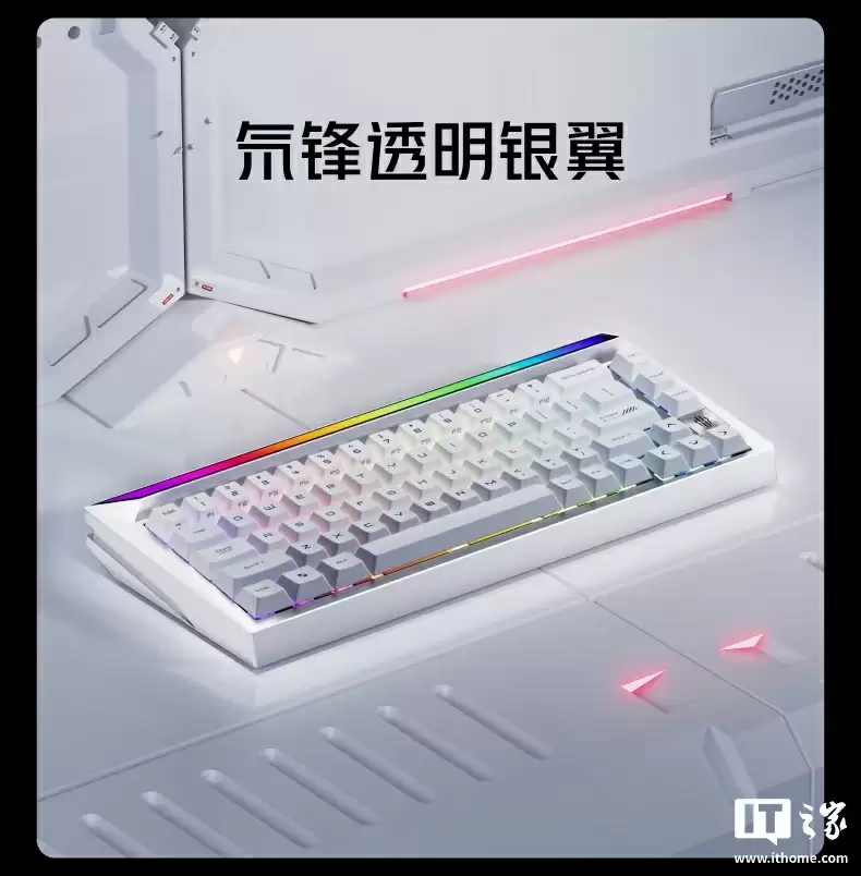 据介绍,红魔首款客制化磁轴键盘采用未来星际战舰设计(几何切割与直线条硬朗设计),提供氘锋透明暗夜、氘锋透明银翼两种配色,并使用 6063 全铝 CNC 精雕外壳(阳极氧化 + 220 目精细打磨)。