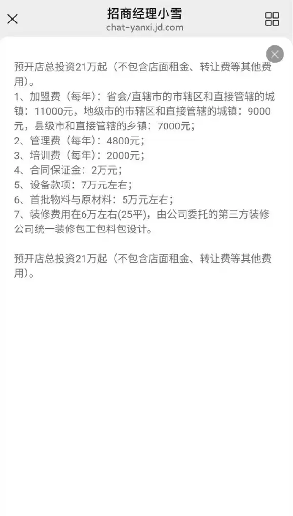 蜜雪冰城招商顾问在回应中确认了具体费用构成,强调预开店总投资需21万元起,且不包含门店租金、转让费等额外支出。