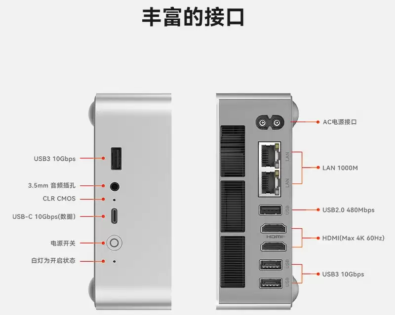 外部接口方面,EQi13 Pro 前后各提供 2 个 USB 10Gbps,后方还有 1 个 USB 2.0 Type-A 480Mbps;此外其具备 2 个千兆 RJ45 网口、2 个 HDMI 2.0、1 个 3.5mm 音频插孔。