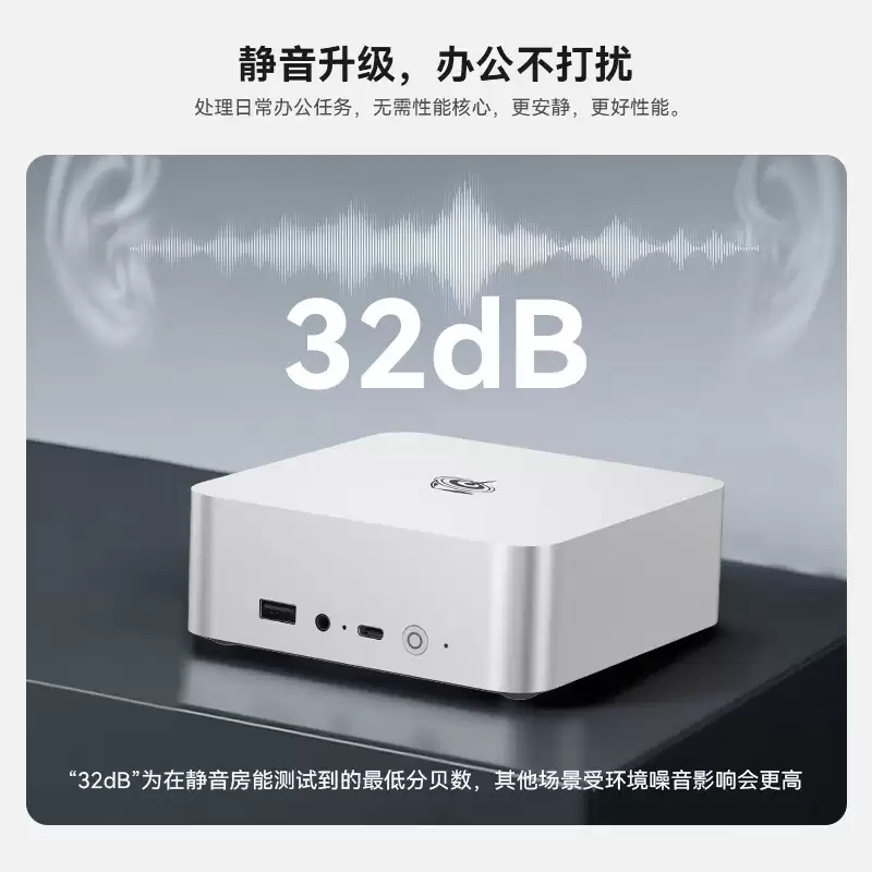 EQi13 Pro 采用金属外壳,内置 85W 电源,三维 126×126×44.2 (mm),具备底部进风的双热管单风扇散热系统,M.2 盘位配有鳍片散热器,最低噪声 32dB。