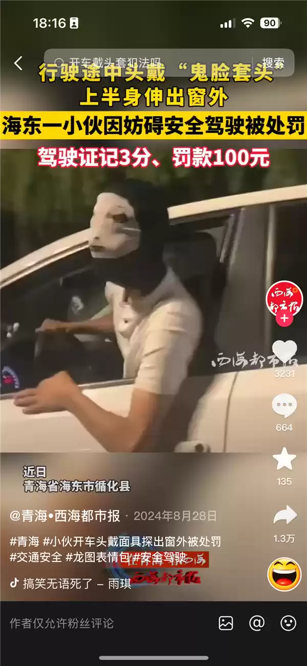 类似事件并非首次发生。去年8月28日,海东市就曾出现一名驾车小伙戴着鬼怪面具将上半身探出车外的危险行为。
