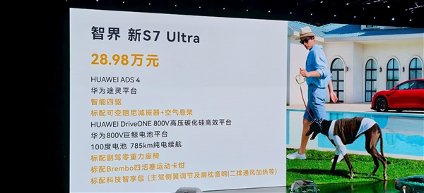 其中新S7 Ultra版配备HUAWEI ADS 4、华为途灵平台智能四驱、可变阻尼减振器+空气悬架、HUAWEI DriveONE 800V高压碳化硅高效平台、华为800V巨鲸电池平台、100度电池、785km纯电续航、标配副驾零重力座椅、标配Brembo四活塞运动卡钳、标配科技智享包(主驾侧翼调节及肩枕音响、二排通风加热等)。