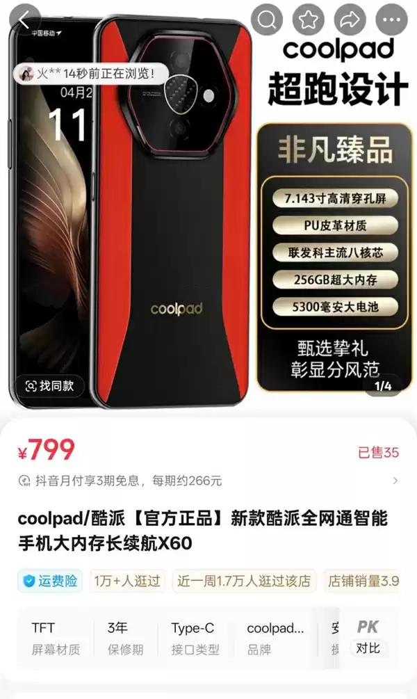 不过,细心的网友发现,在酷派抖音官方旗舰店,上架了“酷派X60”手机,价格为799元,目前已售35单。