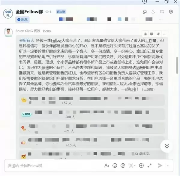 "相信通过我们的专业服务,这些客户未来也会考虑蔚来。希望大家珍惜当下机遇,用心接待每一位客户,共同为品牌发展贡献力量!"