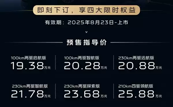 8月23日,备受期待的银河M9正式开启预售。新车共推出6款车型配置,预售价格区间为19.38万至25.88万元。作为一款全新打造的大型六座SUV,银河M9集智能科技与豪华舒适于一身。