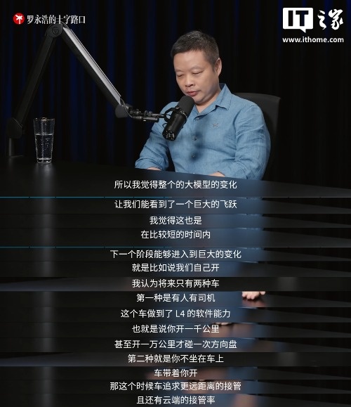 何小鹏认为将来只有两种车:“第一种是具备 L4 级软件能力的有人驾驶汽车,这种车由我们自己开,但开 1000 公里甚至 1 万公里才需要碰一次方向盘;第二种是无人驾驶的汽车,你不用坐在司机位上,车自己会开,这种车会追求更远距离接管和更低的云端接管率”。