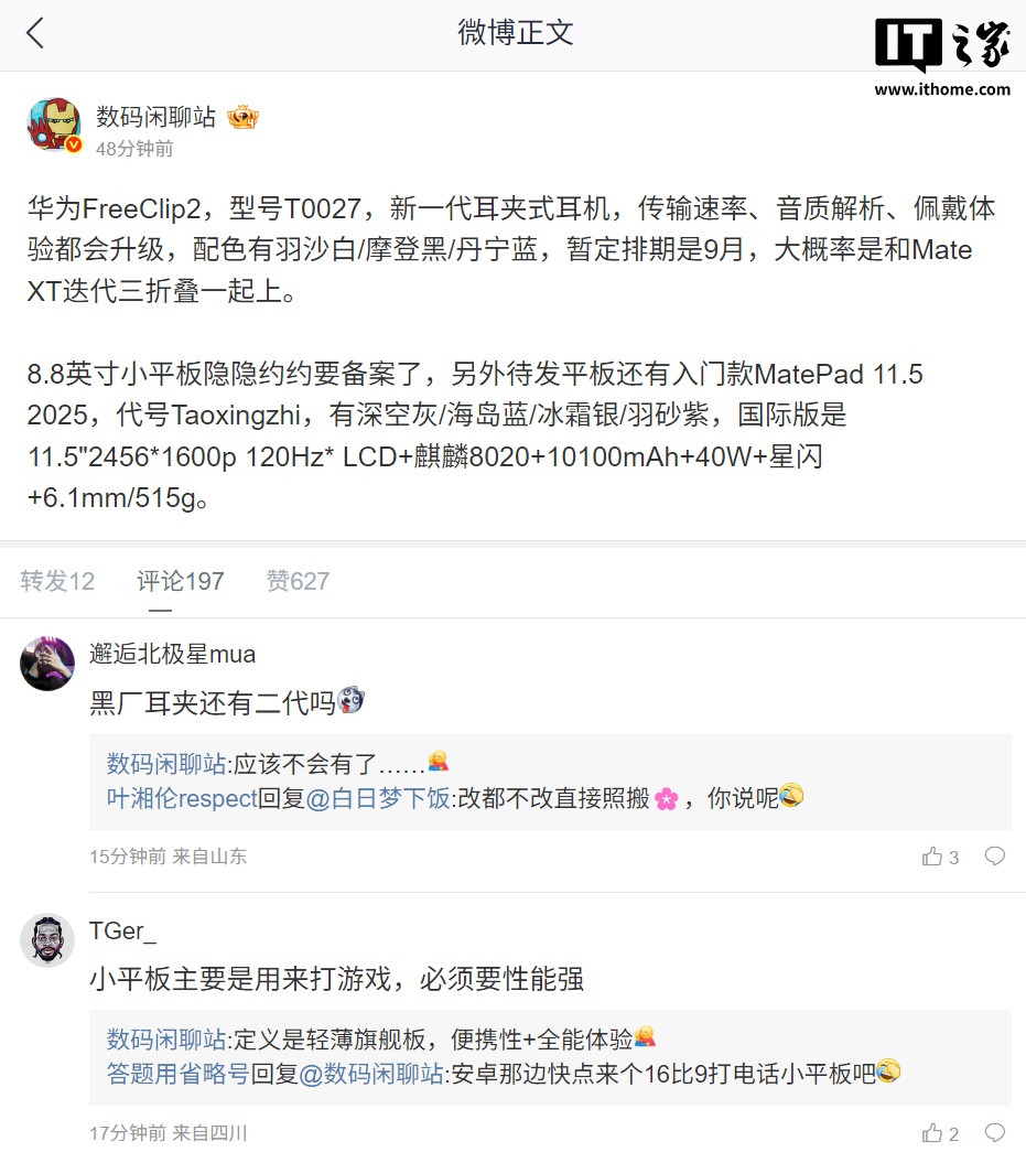 8 月 26 日消息,博主 @数码闲聊站 今日爆料,华为 FreeClip2,型号 T0027,新一代耳夹式耳机,传输速率、音质解析、佩戴体验都会升级,配色有羽沙白 / 摩登黑 / 丹宁蓝,暂定排期是 9 月,大概率是和 Mate XT 迭代三折叠一起上。