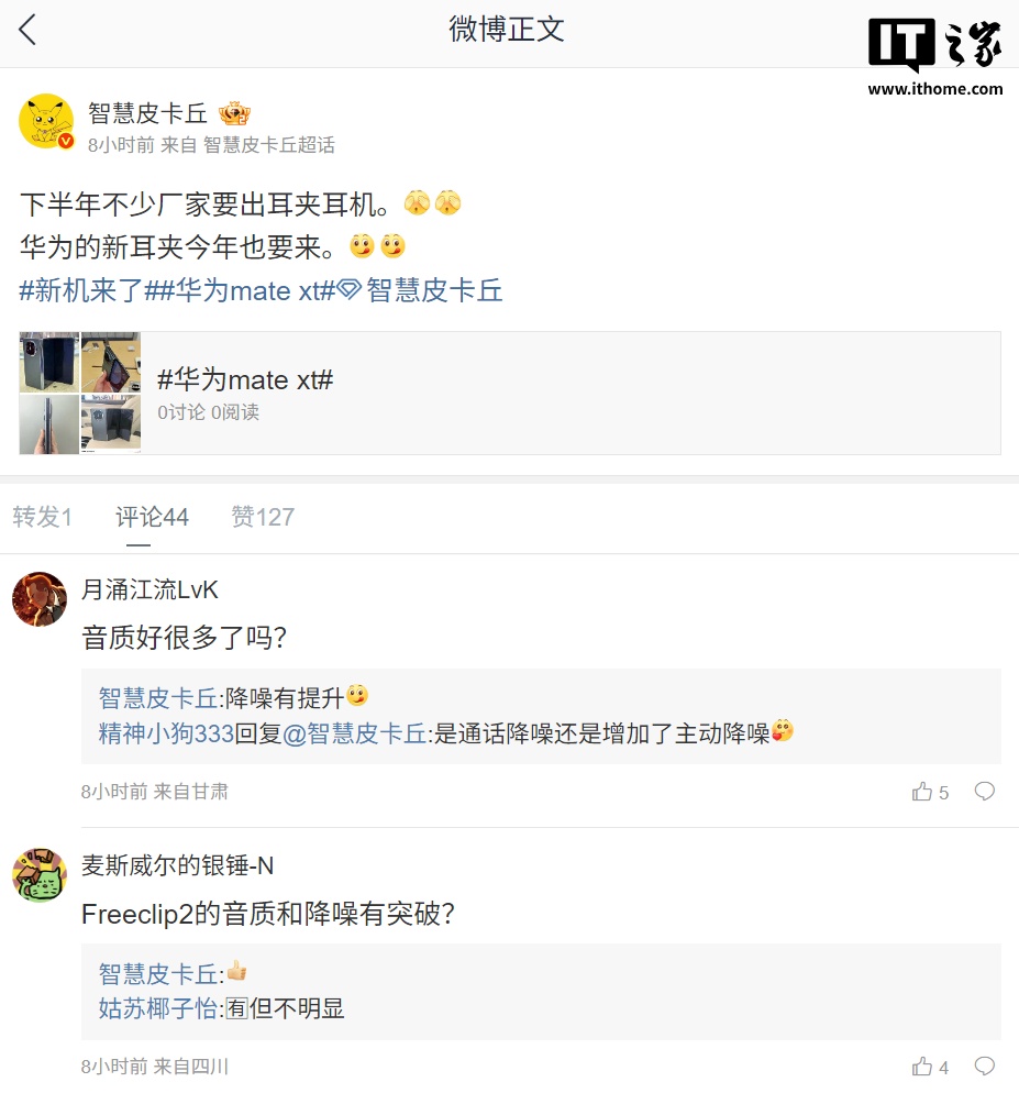 @智慧皮卡丘 还在评论区透露,华为的新耳夹耳机将在降噪方面有所提升,并点赞了“Freeclip2 的音质和降噪有突破”猜测。