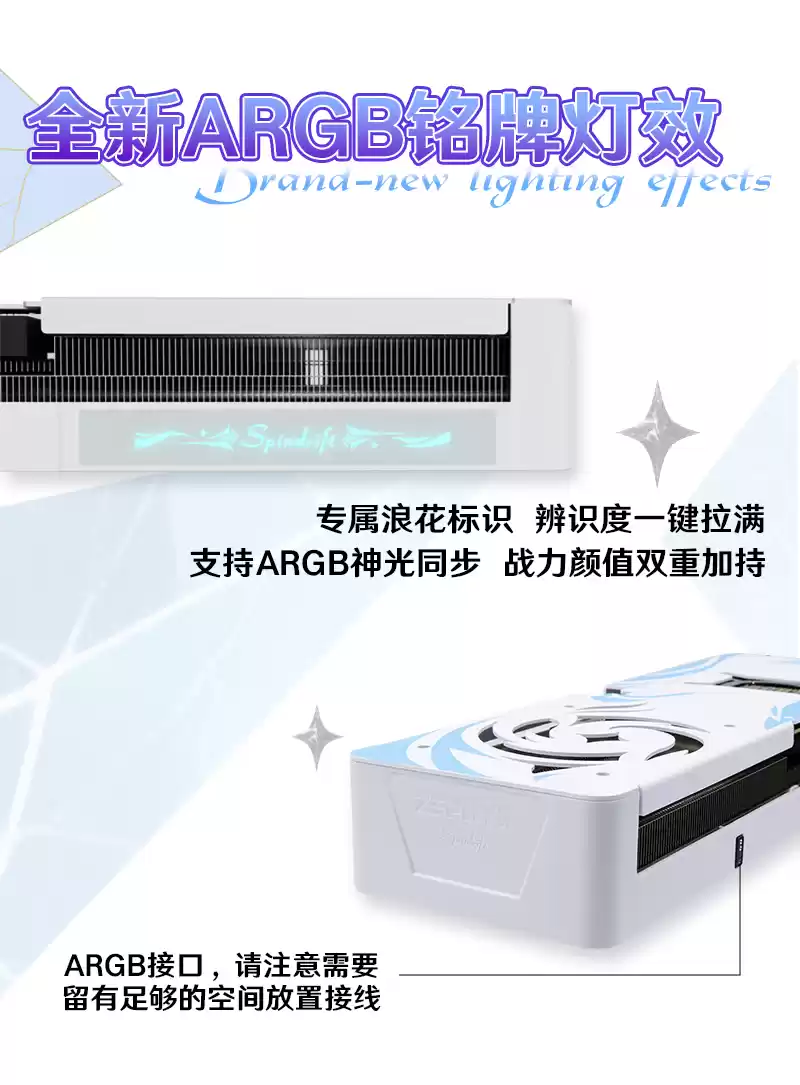 值得一提的是,显卡上侧特别配备了带有浪花标志的ARGB灯效铭牌,3-Pin 5V ARGB接口则巧妙地布局在显卡下方。