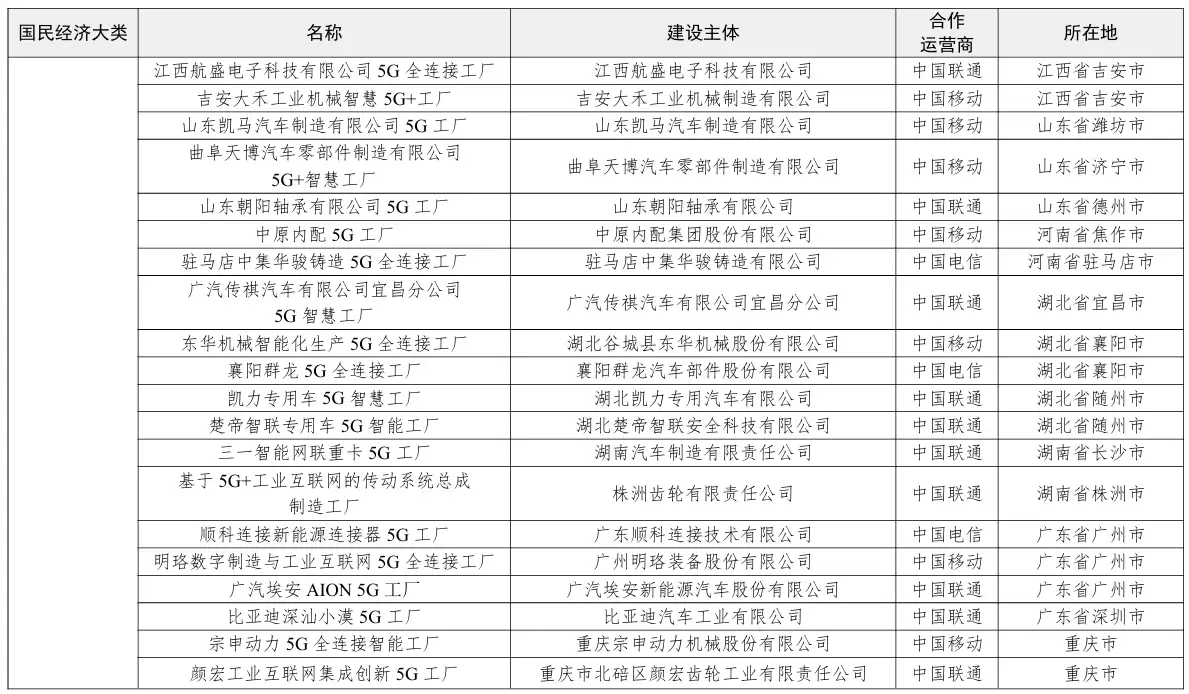 汽车制造业大类中,理想汽车星环 5G 工厂、江铃控股有限公司 5G 智慧工厂、广汽传祺汽车有限公司宜昌分公司 5G 智慧工厂、比亚迪深汕小漠 5G 工厂、宗申动力 5G 全连接智能工厂、重庆建设雅马哈摩托车 5G 工厂、长安 5G 工厂等入选。