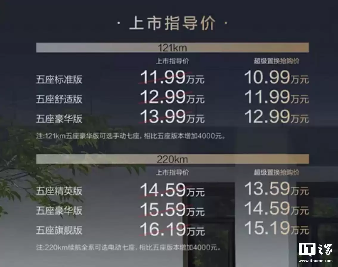 8 月 26 日消息,捷途汽车宣布旗下山海 L7 PLUS 中型 SUV 正式上市,该车搭载 1.5T 插混动力,共提供 6 款配置车型,上市指导价 11.99 万元起,旧车超级置换抢购价便宜 1 万元,同时可加 4000 元更换为 7 座车型版本。整理价格如下: