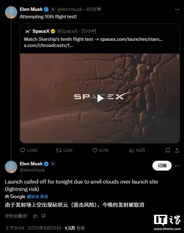 注意到,SpaceX 创始人马斯克表示,由于发射场上空出现砧状云(雷击风险),今晚的发射被取消。