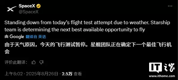 8 月 26 日消息,SpaceX 表示,由于天气原因,今天的星舰飞行测试暂停。星舰团队正在确定下一个最佳飞行机会。