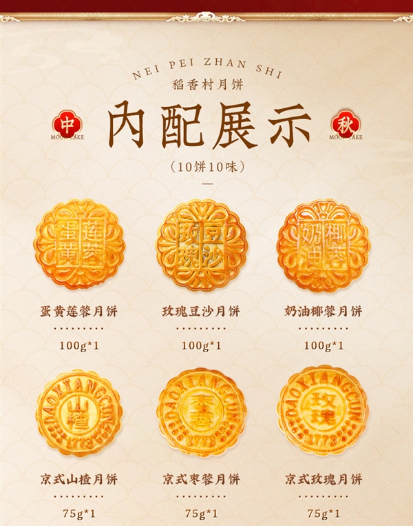 100g玫瑰豆沙月饼*1; 75g京式山楂月饼*1;
