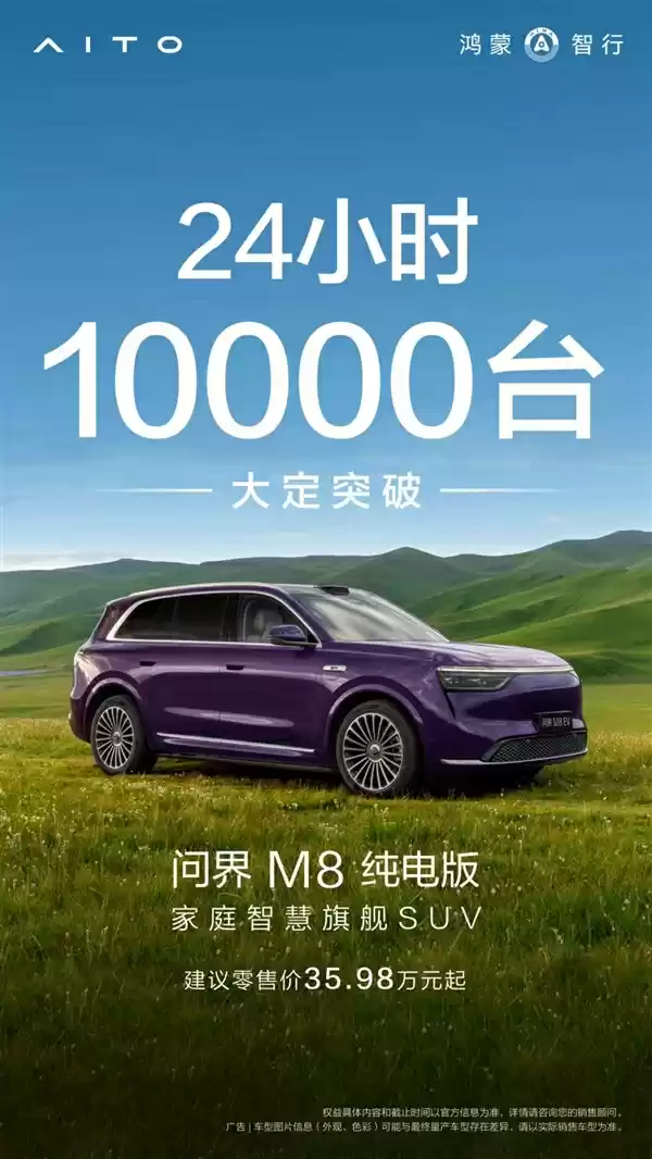 8月26日消息,鸿蒙智行官方宣布,问界M8纯电版上市24小时,大定突破10000台。