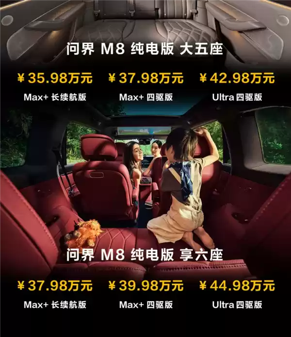 据了解,全新问界M8纯电版已于日前上市,共推出3个版本6款车型,售价区间为35.98-44.98万元,纯电和增程版同价。