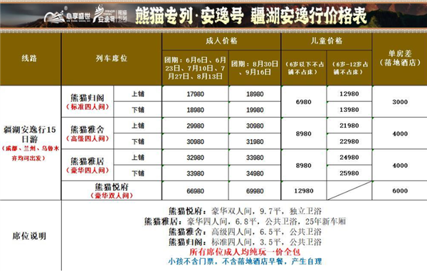 例如,8月30日和9月16日出发的班次中,最低价为熊猫归阁上铺18980元/人,最高价为熊猫悦府69980元/人,6岁以下儿童不占铺位不占床位最低价为熊猫归阁6980元/人,费用含餐食、住宿、导游等服务,且最晚需提前3天结清所有费用。