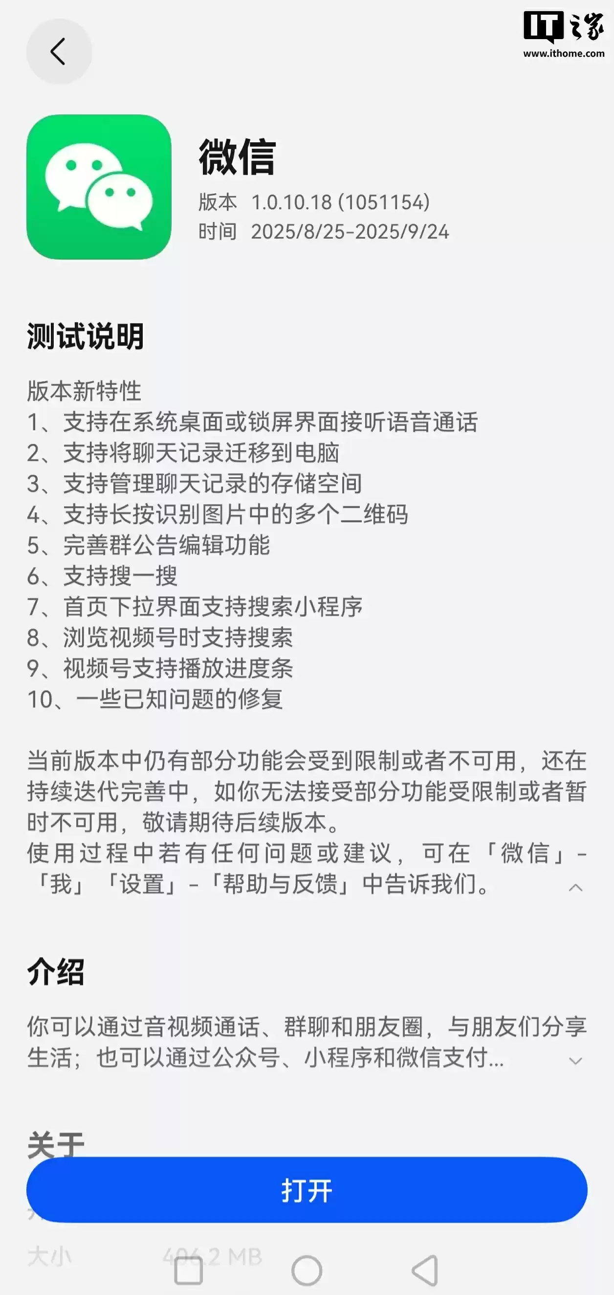 8月26日消息,微信鸿蒙版App今日晚间在华为应用市场开启新版本测试,版本号为1.0.10.18。此次更新需收到官方短信邀请的用户通过链接跳转安装,尚未收到通知的用户还需耐心等待。本次测试周期为2025年8月25日至9月24日。